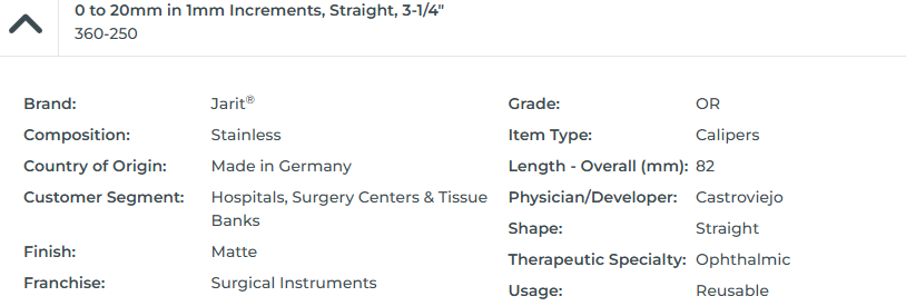 CASTROVIEJO CALIPER, 3-1/4, 0 TO 20MM, STRAIGHT